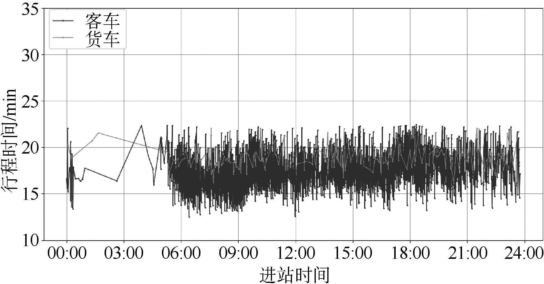数据清洗前后对比结果如图1,图2所示,对比可以看到通过数据预处理,数据集去除了错误异常的个例,保留了大部分可以表现行程时间变化趋势的数据。