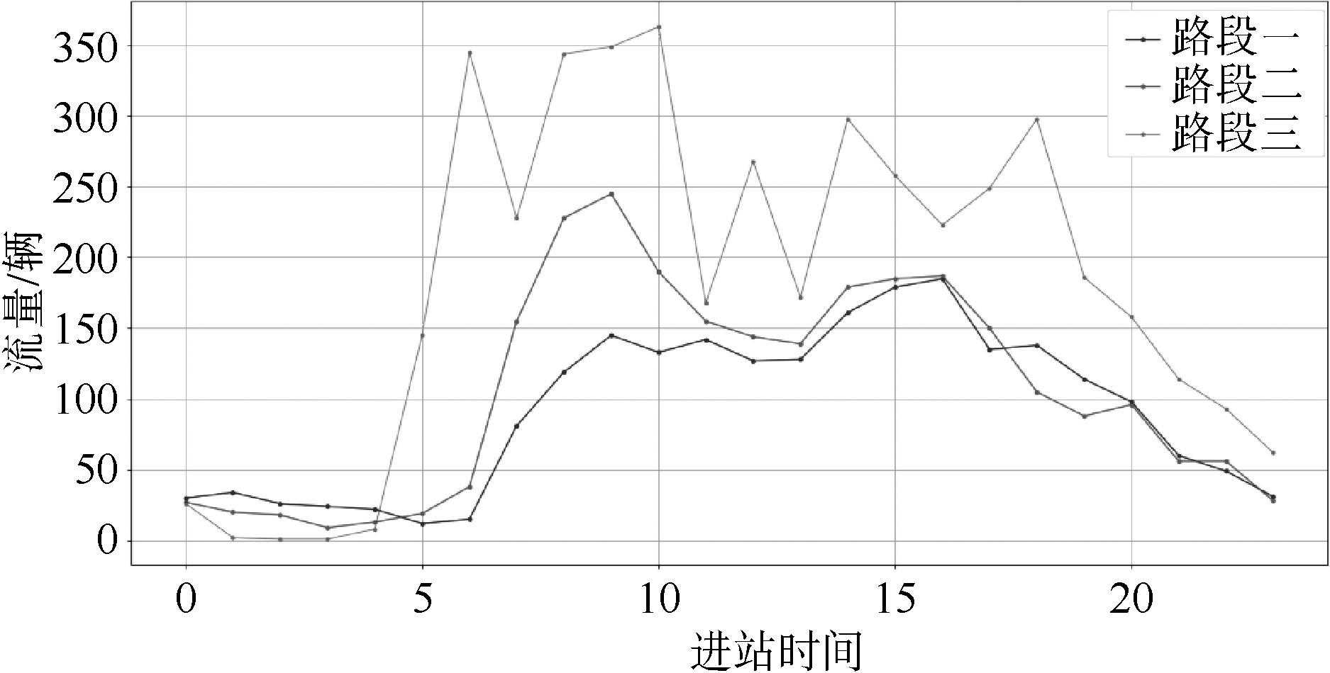 本次原始数据中货车占比少,加之货车司机对时间成本相对不敏感,因此以下预测分析主要以客车为研究对象。3段高速公路的进站流量24h分布如图6所示,可以看出,进站流量全天内呈现明显的分布特征,均在上午或下午出现高峰或次高峰,按照高峰、次高峰和平峰3个特征将6:00~24:00进行划分(见表3),以此为基础为相应时段内的数据进行标签分类。