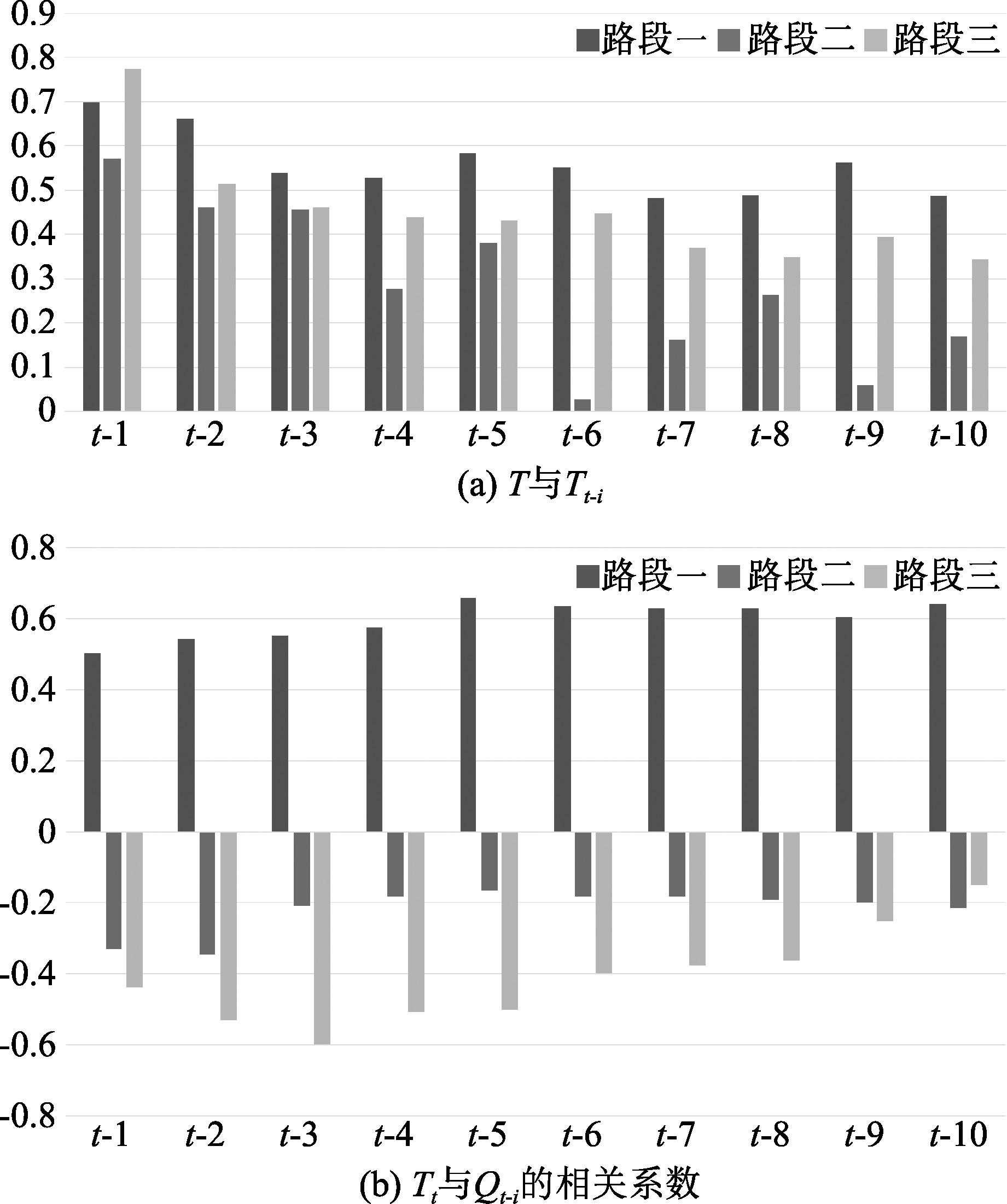 图7可以看出,3段高速公路的行程时间Tt与前序行程时间Tt-i均呈正相关,路段二相关系数波动较大,路段一、三波动相对平稳,3个路段与Tt相关系数最大的均为临近的Tt-1、Tt-2;而行程时间Tt与进站流量Ct-i相关性结果显示,路段二、三为负相关,路段一则呈正相关,3个路段的相关系数波动均不大,但是与行程时间Tt相关系数最大的流量在时间上都呈现一定的延后性,如路段一Tt与进站流量Ct-5和Ct-6正相关最大,而路段二、三分别与Ct-1和Ct-2、Ct-2和Ct-3的负相关最大。
