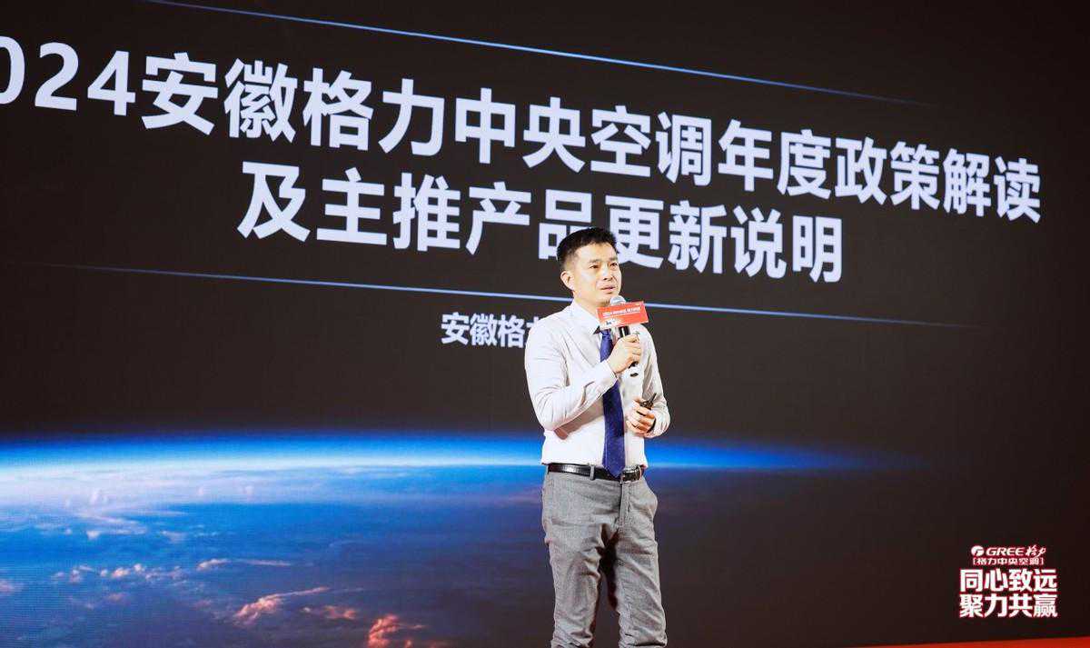 安徽格力中央空调工程设备有限公司商用空调部部长余根对2024安徽格力中央空调年度政策解读及主推产品更新说明。余根介绍了格力2024年新品,包括GMV祺居家庭中央空调、工程风管机新机、全新升级K系列多联机室内机、全系列多联机、C系列变频模块机、敏捷群控系统、全新一代商铺机、H系列风机盘管变频商用热水机、热氟融霜冷暖机组、并联螺杆等。
