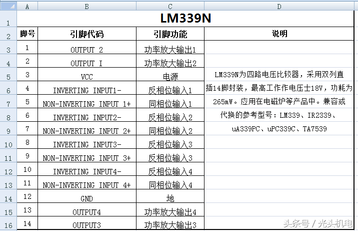 这一款IC很常见,相信很多老师傅都认识,LM339N为四路电压比较器,采用双列直插14脚封装,最高工作作电压士18V,功耗为265mW。应用在电磁炉等产品中。兼容或代换的参考型号:LM339、IR2339、uA339PC、uPC339C、TA7539