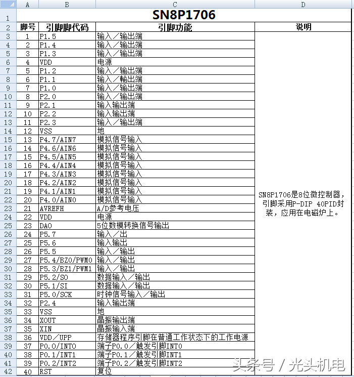SN8P1706是8位微控制器,引脚采用P-DIP40PID封装,应用在电磁炉上。