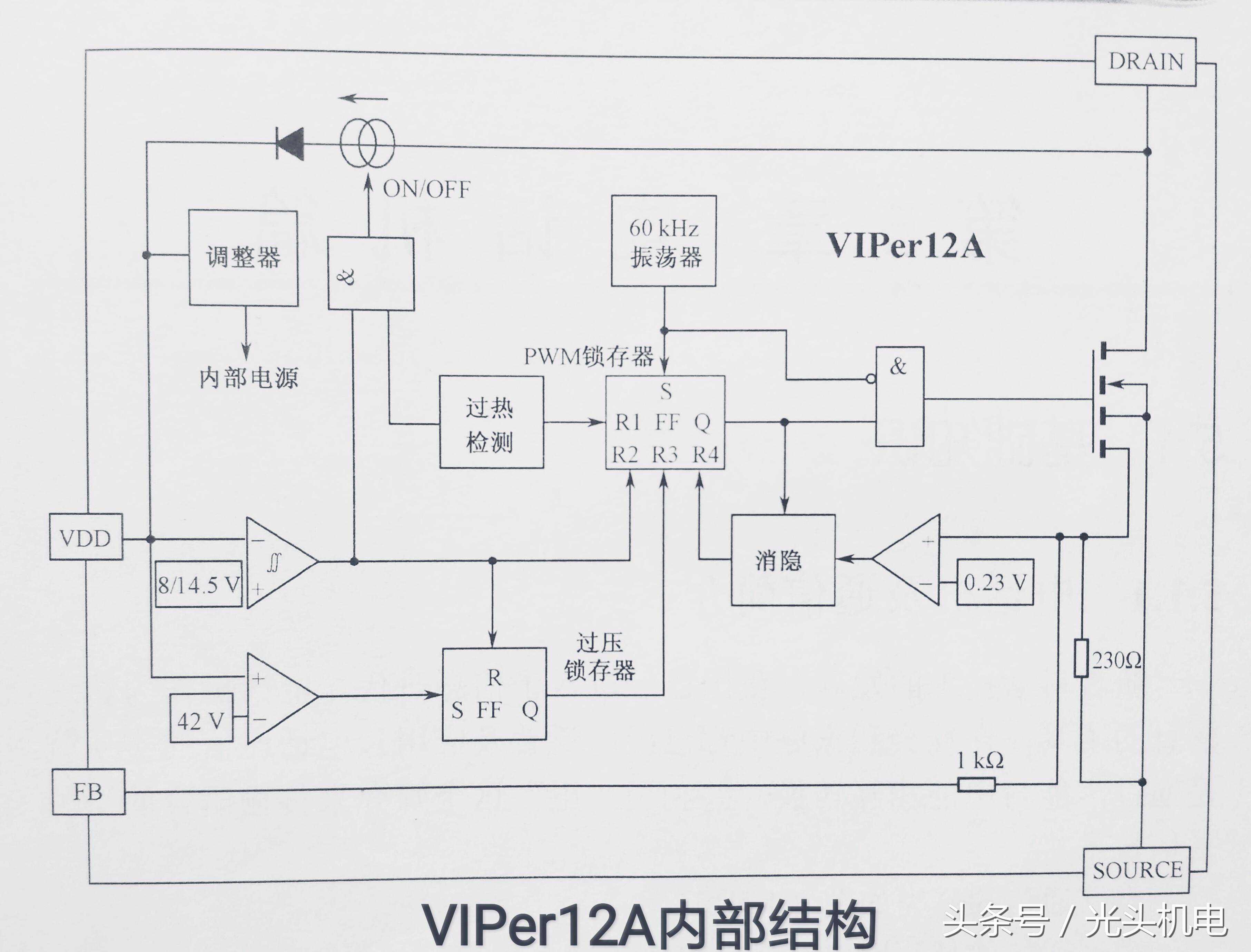 VIPer12A为电源IC模块,采用SO-8和DIP8封装,应用用在电磁炉上。其内部结构如下图所示