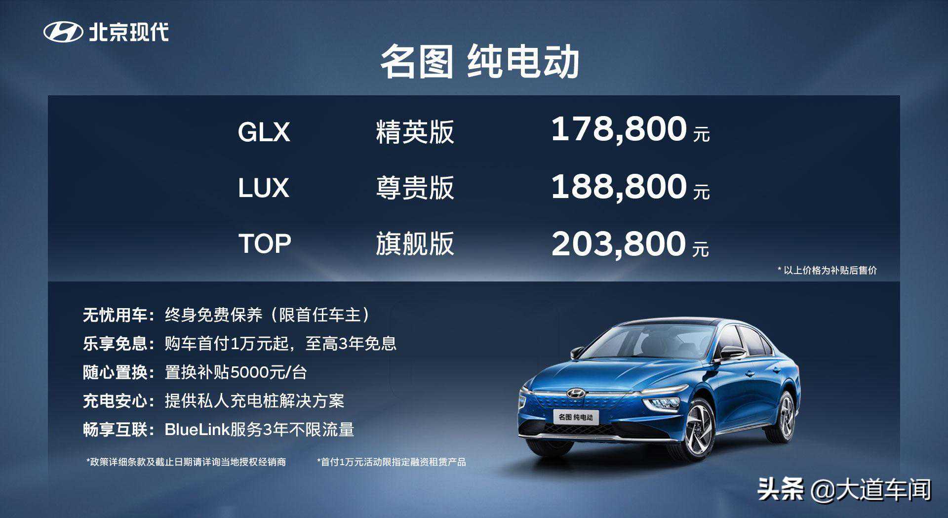 名图纯电动是北京现代今年一季度专门面向家庭用户推出的B级纯电轿车产品,全系共有520km续航里程的3款不同配置车型,补贴后售价17.88-20.38万元。