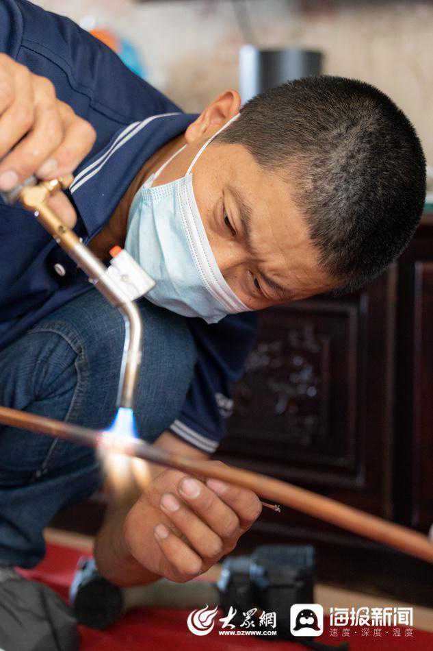图:当空调铜管不够长时,侯长城还要通过焊接加长铜管。(大众网·海报新闻记者毕胜摄)