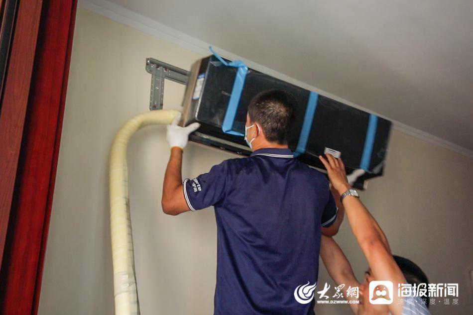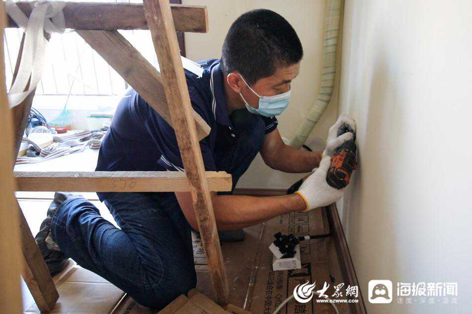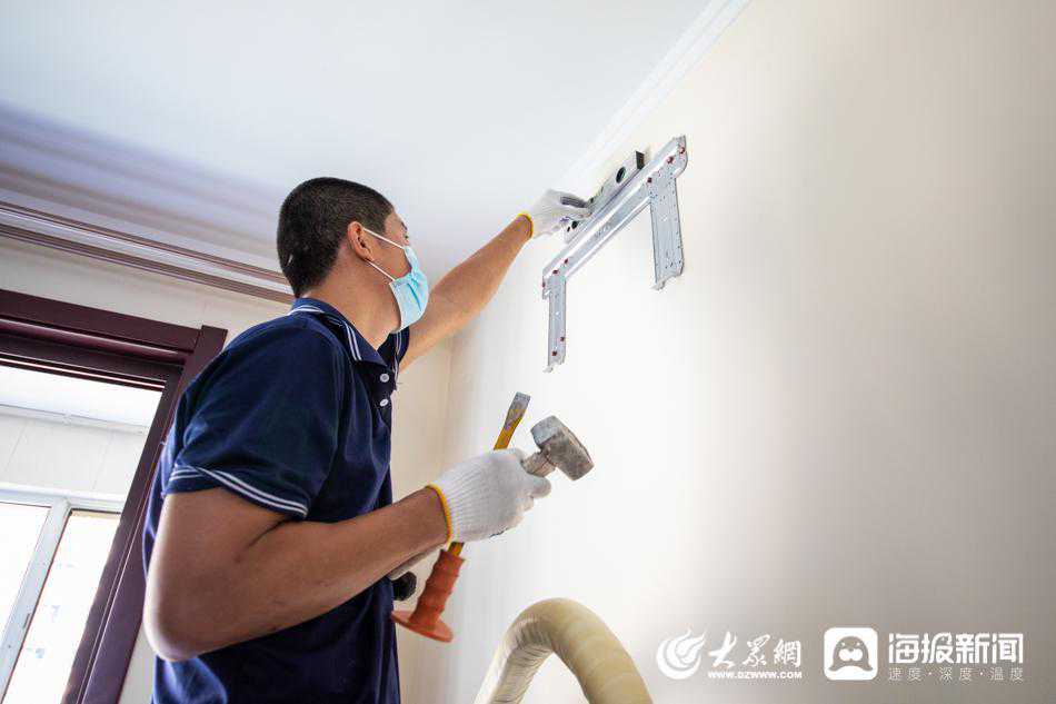图:侯长城正在挂空调内机。(大众网·海报新闻记者毕胜摄)