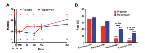 在随后的2周内,研究发现时间与治疗方法有着显著的相互作用(F(8,245)=2.02,P=0.04),此结果表明雷帕霉素可延长氯胺酮的抗抑郁作用。在氯胺酮给药两周后,雷帕霉素+氯胺酮治疗的反应率(41%)及症状缓解率(29%)与安慰剂+氯胺酮(13%,p=0.04;7%,P=0.003)相比更高。