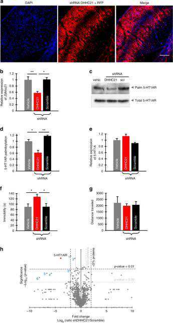 5-羟色胺能系统,尤其是5-羟色胺1A受体(5-HT1AR)与重度抑郁症(MDD)有关。在这里,我们证明了5-HT1AR在人和啮齿类动物大脑中出现棕榈酰化,且ZDHHC21作为主要的棕榈酰转移酶,其耗损会降低5-HT1AR的棕榈酰化,进而降低了5-HT1AR的信号传导功能。啮齿动物在两种抑郁造模后,均出现脑内ZDHHC21表达减少,5-HT1AR棕榈酰化减弱。此外,ZDHHC21在小鼠前脑中的选择性敲除也诱导了抑郁样行为。我们还发现miR-30e(microRNA)是Zdhhc21表达的负调控因子。