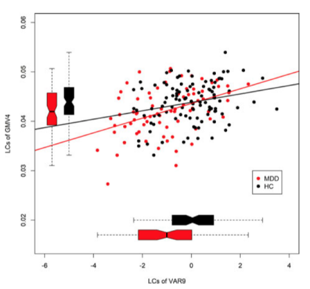 GMV4、VAR9组分负荷系数(LCs)散点图(MDD、重度抑郁症;HC、健康对照组)