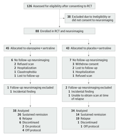 研究设计和参与者:对在5个学术中心进行的为期36周的双盲随机安慰剂对照试验进行二次分析。参与者年龄在18至85岁之间,均来自多中心精神性抑郁症药物治疗II研究(STOP-PDII)。所有参与者均为有精神症状的抑郁症患者(精神性抑郁症),并使用奥氮平和舍曲林治疗12至20周,其中包括8周有精神病缓解和抑郁症缓解/近缓解的。然后将参与者随机分组以继续接受该方案,或在随后的36周期间改用安慰剂和舍曲林。所分析数据的时间为2018年10月至2019年2月之间。