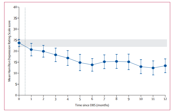 发现:2013年12月5日至2016年9月30日期间,在225名接受资格审查的患者中,有23名患者被选入进行DBS手术。一名患者退出治疗后,随机分配剩余的22名患者(平均年龄46.4岁,扫描电镜3•1;10名女性[45%]和12名男性[55%]),10名患者(45%)接受低剂量组刺激,12名患者(55%)接受高剂量组刺激。且患者接受6个月和12个月的随访。6个月时,在随机化阶段,SPW组和LPW组的HDRS评分均显著降低(),且两组得分并无显著差异(p=0.54)。交叉组在6-12个月内,组内(p=0.15)和组间(p=0.21)的HDR没有显著下降。两组的不良反应相同。焦虑、抑郁加重是最常见的心理不良事件。SPW组中的一名病人死于自杀。