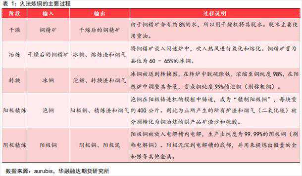 火法冶炼是目前铜冶炼的主要形式。在这个过程中,开采出铜矿在矿场被粉碎、研磨、浮选成含铜量在20-30%的铜精矿,除了铜外,铜精矿中铁和硫各约占30%,金、银和其他贵金属也有微量回收。铜精矿是火法冶炼的原料,然后通过熔炼、吹炼、精炼等环节形成阴极铜。更细节的流程见下表。