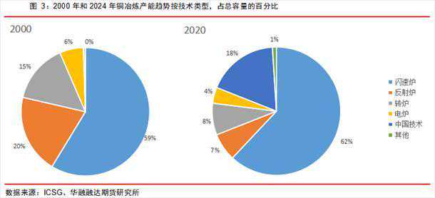 闪速炉在冶炼的过程可以利用硫化物氧化的反应热进行冶炼,非常的节能。2000年,闪速/连续技术的使用占铜冶炼总产能的59%。到2020年,这一比例上升到65%。反射炉则由于没有充分利用硫的热值,而且它们的废气中二氧化硫浓度很低,硫酸的回收是不经济的,大气污染也很严重。它的产能占比从2000年的20%下降至2020年的7%。电炉一直被限制在电力非常便宜的地区占比一直较低。中国的技术也在迅速扩张,其最高出现在2004年。目前的产能占比约为18%。