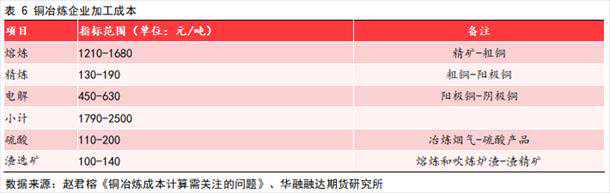 从火法炼铜到阴极铜所产生的成本主要分为五个部分,分别是粗炼成本、电解成本、烟气制酸成本、渣选矿成本及阳极泥处理成本。其中粗炼成本是最主要的成本构成,并且不同方法之间技术和成本都有较大的差异。