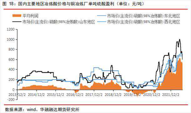 2020年以来,硫酸价格呈现快速上涨趋势,截至2022年7月14日,东北、山东、西北地区平均冶炼酸价格约为660元/吨。当前价格下与155元/吨左右的加工成本相比,单吨硫酸净盈利约为505元/吨。根据江西铜业和铜陵有色的数据显示,目前国内冶炼一吨阴极铜大概能产出3吨硫酸。这样来看,铜冶炼厂的副产品硫酸盈利能达到1515元/吨的高位。