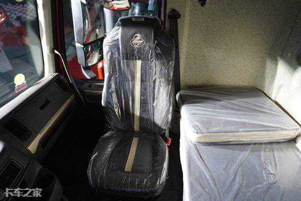 深色的内饰颜色,抗污性更好,中控台区域布置位置偏向于主驾,驾驶员伸手便可操作。高顶双卧驾驶室的设计很好解决了两人同时休息的问题,值得一提的是,副驾驶座椅可以进行180°旋转,搭配车上的卧铺坐垫,下铺秒变“大床房”。