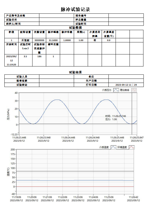 试验的主要参数设置信息如产品型号、时间、波形、开始试验时间、脉冲试数、压力、频率、温度等试验数据可以如下报告形式导出试验结果: