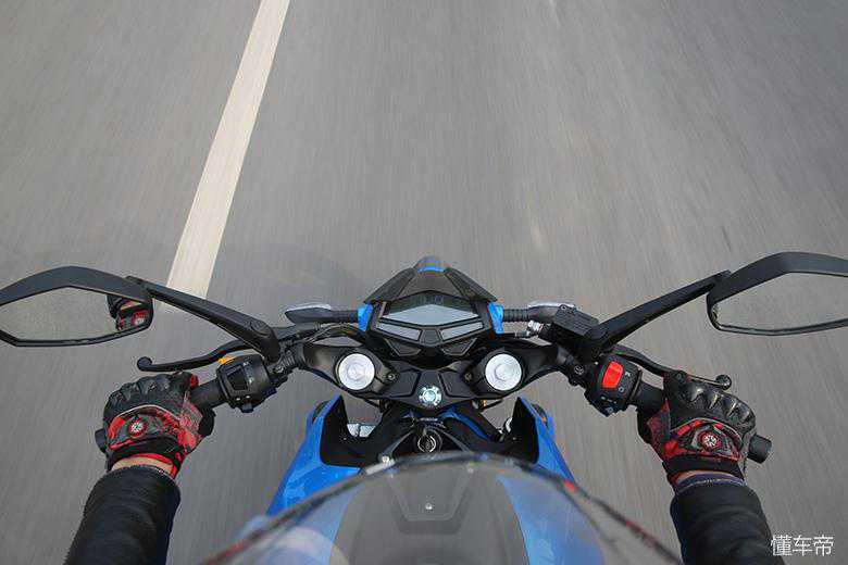 分体式车把有提升车辆操控的效果,车把增高后还提供了一定的舒适性,第一视角看过去,有点跑车的感觉,能给人很强的驾驶欲望。但也可以看到在光线较强的情况下,仪表的亮度暗了些,还有轻微的反光现象。