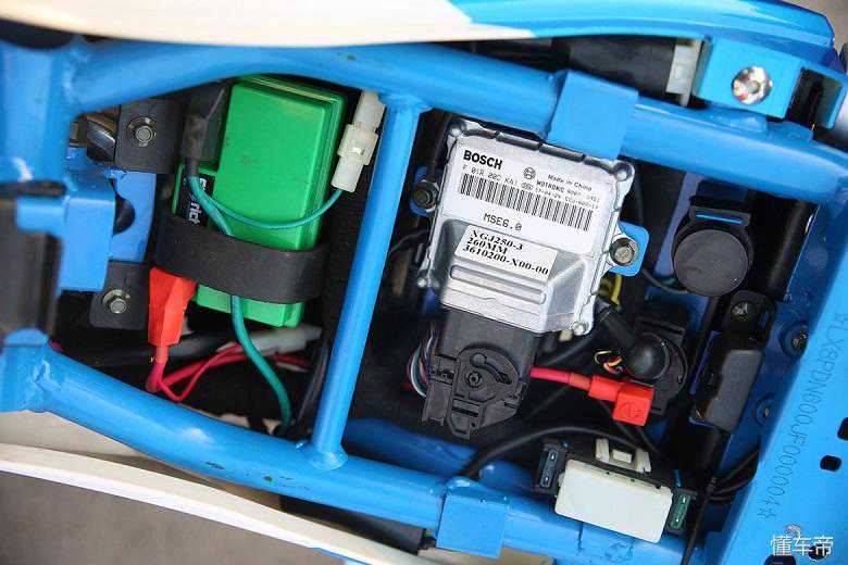 打开座椅,可以看到博世的ECU和锂电池,这两项同级少见。