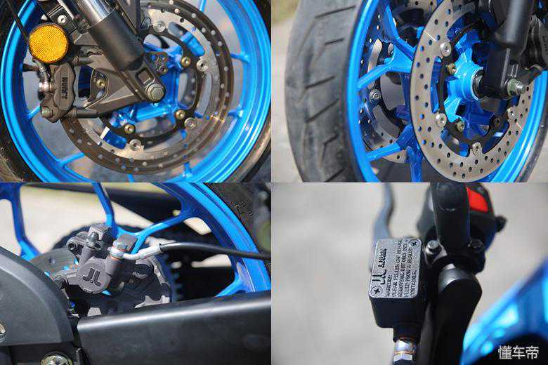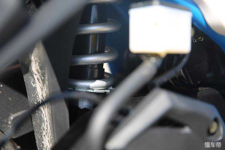 前后整套制动都是由“西互”提供,国内大排中春风常用的一家制动品牌,前双活塞浮动盘配辐射卡钳,制动性能、手感各方面已经可以了。测试车还预留了ABS接口,后期应该会有ABS版以供选择。