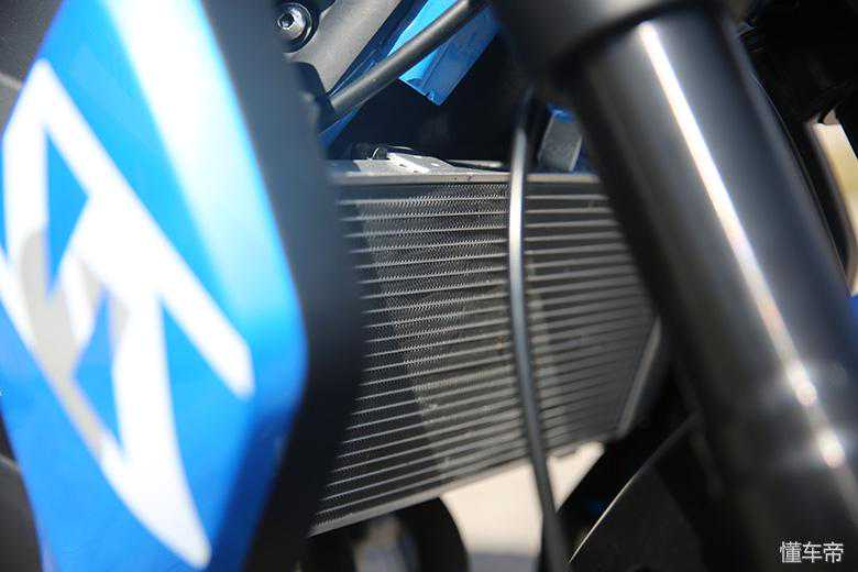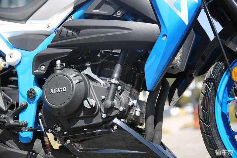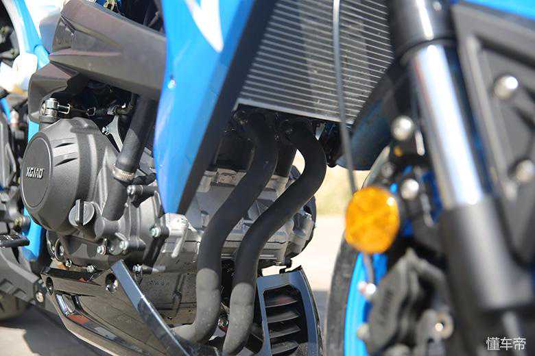 油箱侧翼的线条比较复杂,让本就硬朗的油箱显得更加有力,沿着粗壮的钢管车架到饱满的发动机,这个部位看过去,力量感十足。