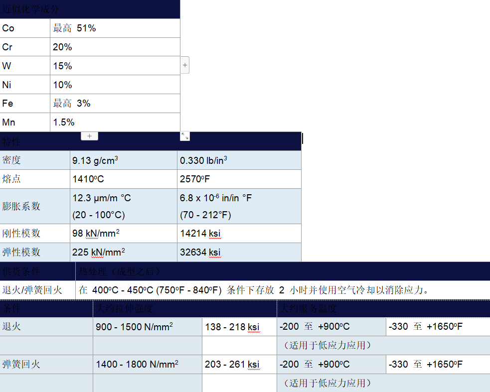 是一个钴-镍-铬-钨合金,在980oC(1795oF)下长时间暴露时,具有良好的高温强度和良好的抗氧化环境性能。它还具有优良的耐硫化性能。