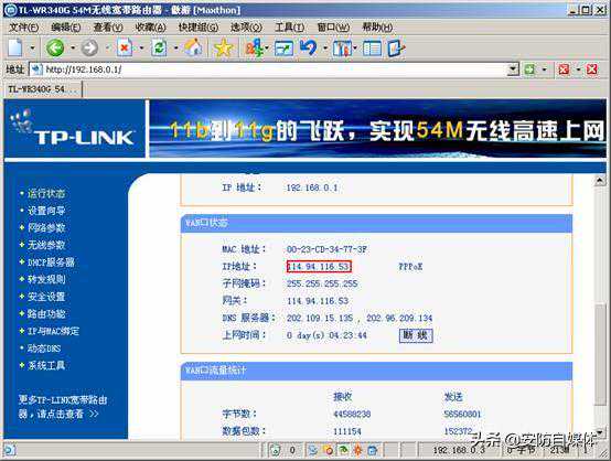 3.测试外网访问。(a)获取路由器的外网IP地址,如下图所示