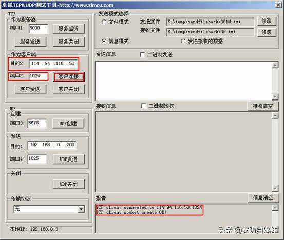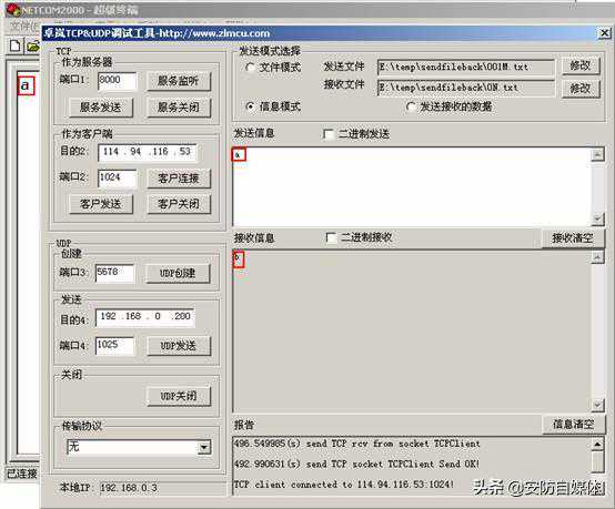 (c)此后TCPUDP调试工具和模块的串口可以进行数据通信,如下图所示