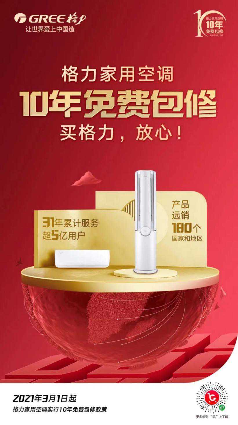 为全面保障消费者权益,格力电器于2021年率先在行业内打响“十年免费包修”的第一枪。承诺消费者2021年3月1日起在全国范围内购买制冷量小于或等于14000w(≈5.6匹)、于家庭民用场景安装使用的格力家用空调产品,均可享受十年免费包修服务,相当于给空调上了一个“终身保险”。
