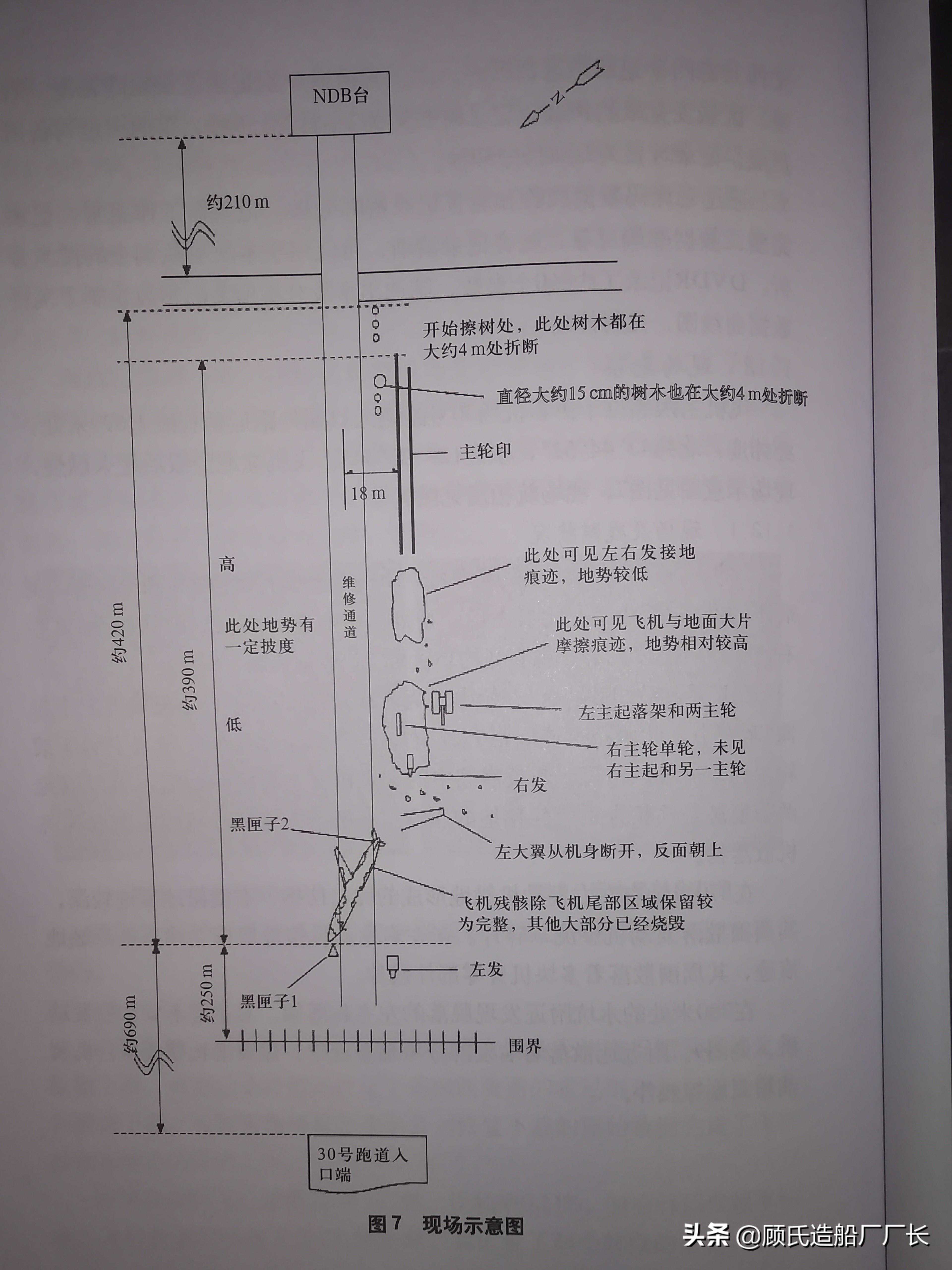 主残骸位于30号跑道入口端690米处,主残骸散布在长约35米、宽约25米的范围,该区域分布在左右机翼、尾翼、前起落架及全部机身,飞机残骸纵轴与跑道中心延长线呈13°右交叉角。
