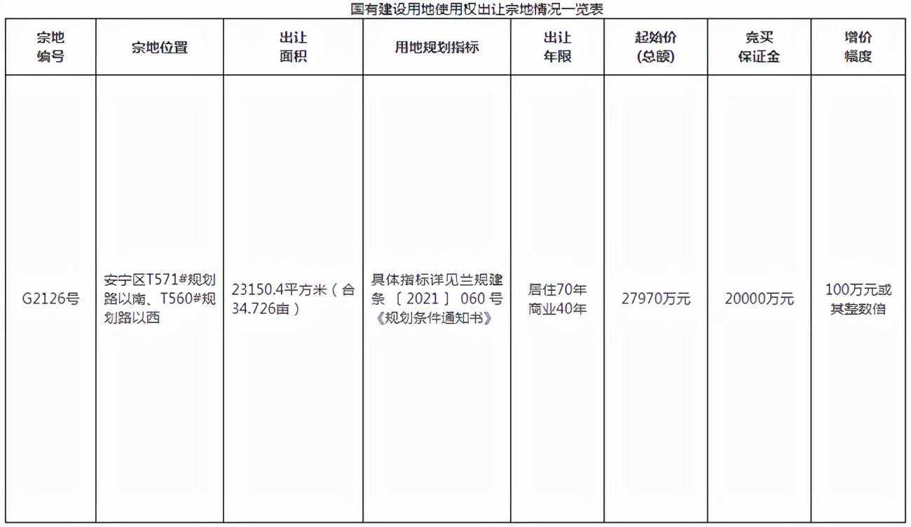 G2126号宗地位于安宁区T571规划路以西,出让面积约23150.4平方米(合34.726亩)。该地块规划出让年限为居住70年,商业40年,容积率≤2.9,绿地率≥30%,建筑密度≤25%,起拍价为27970万元,竞买保证金为20000万元。