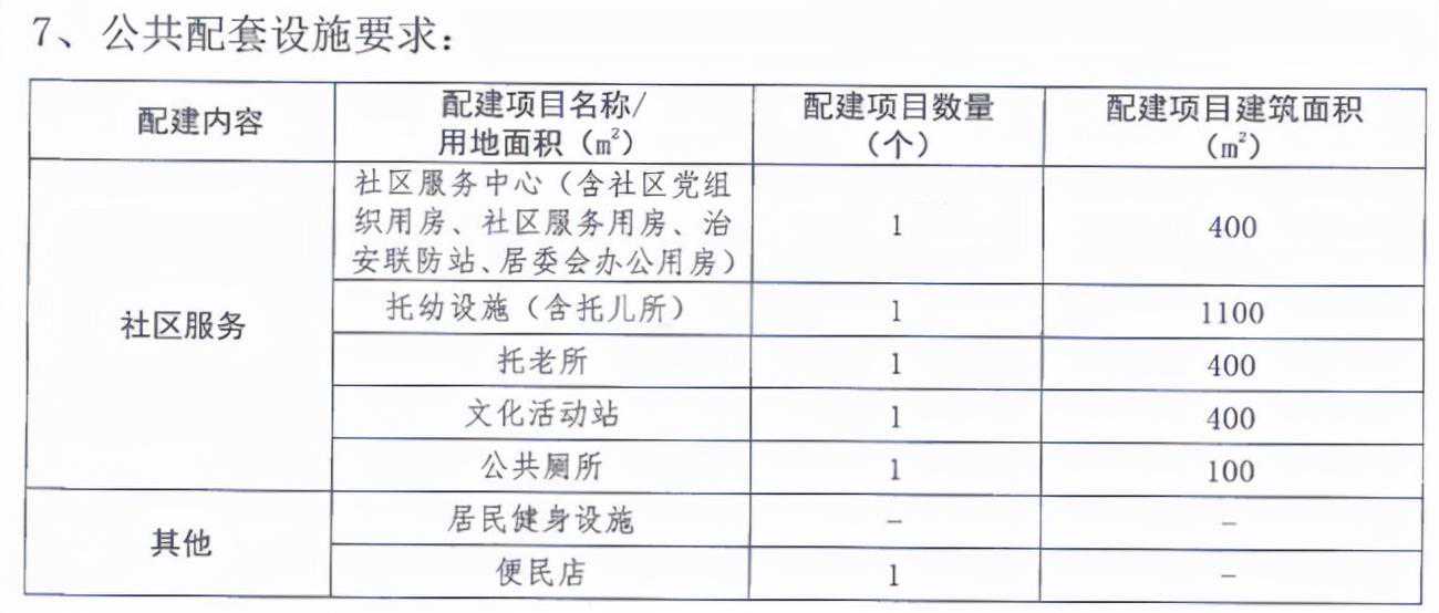 根据规划条件,建设项目将配建社区服务中心,建筑面积约400㎡,一处托儿所,建筑面积约1100㎡,一处托老所,建筑面积约400㎡;此外还规划建设文化活动站、便利店、居民健身设施,建成后无偿移交市政府或市政府指定的部门(县区政府)。竞得人造成土地闲置,未动工开发满一年的,应按照土地出让价款的20%缴纳土地闲置费;未动工开发满两年的,无偿收回国有建设用地使用权。
