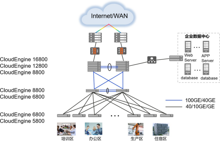 CloudEngine6865也可用于园区网场景,其业界领先的高密度全线速25GE/10GE端口,高性能堆叠满足网络带宽日益增长的需求;其丰富的业务特性、创新的节能机制使得CloudEngine6865成为园区交换机高性价比的选择。