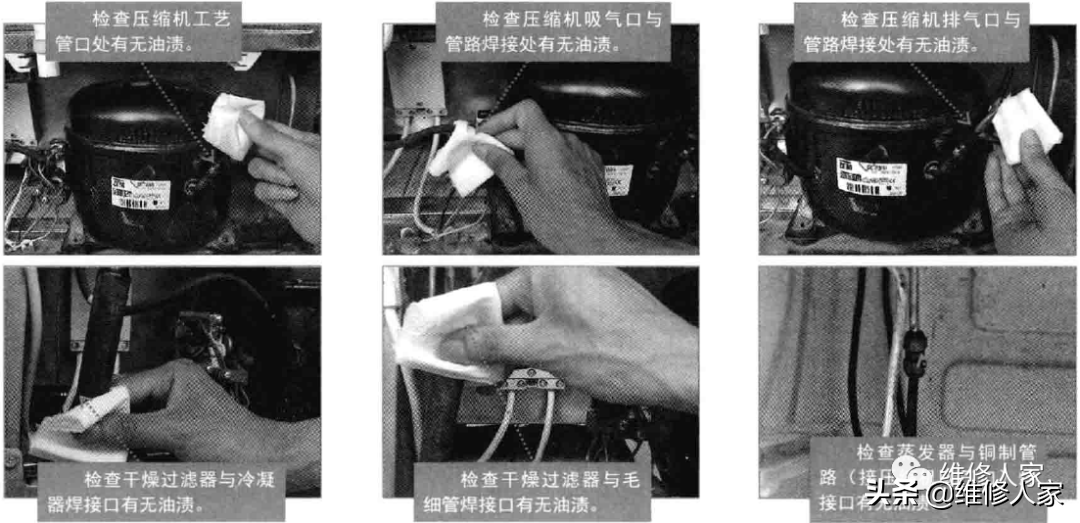 电冰箱管路系统中部件之间多采用焊接方式,焊接部位较容易出现泄露,因此检修电冰箱时,还应仔细观察各个焊接点处有无油渍泄露(压缩机的冷冻机油),对判断管路系统是否存在泄漏点有很大帮助。