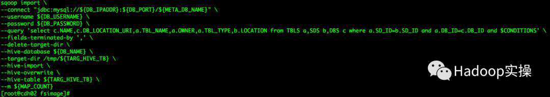 [root@cdh02fsimage]!/bin/bash#将Hive元数据库中的库及表等信息抽取到Hive仓库sqoopimport\--connect"jdbc:mysql://${DB_IPADDR}:${DB_PORT}/${META_DB_NAME}"\--username${DB_USERNAME}\--password${DB_PASSWORD}\--query',_LOCATION_URI,_NAME,,_TYPE,,SDSb,_ID=__ID=_IDand$CONDITIONS'\--fields-terminated-by','\--delete-target-dir\--hive-database${DB_NAME}\--target-dir/tmp/${TARG_HIVE_TB}\--hive-import\--hive-overwrite\--hive-table${TARG_HIVE_TB}\--m${MAP_COUNT}
