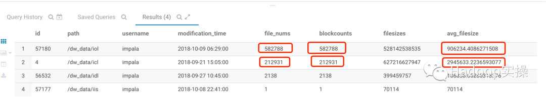 SELECTn.*,(/_nums)ASavg_filesizeFROMhdfs_meta_dirsp,(,,count(*)FROMhdfs_meta_dirsaJOINhive_table_=_,)m,(,count(1)file_nums,sum()blockcounts,sum()filesizesFROMhive_table_detailsa,hdfs_meta_=)==_numsdesc,avg_filesizeasc;