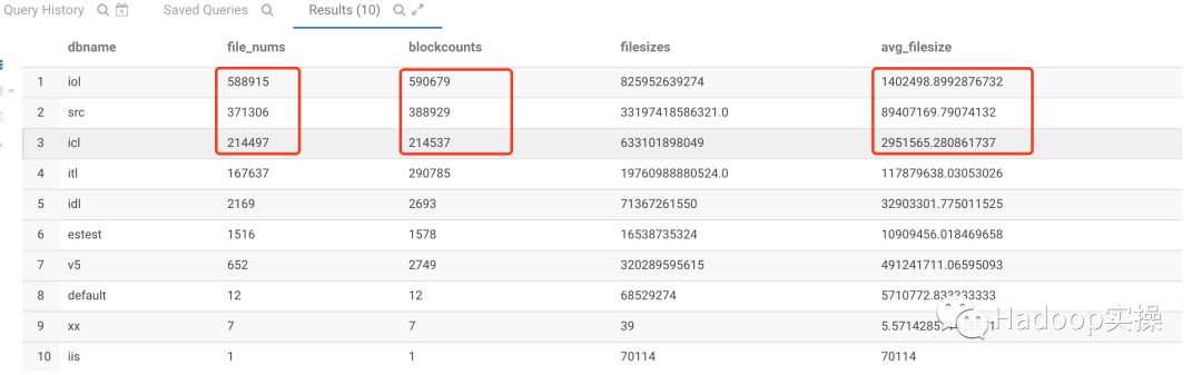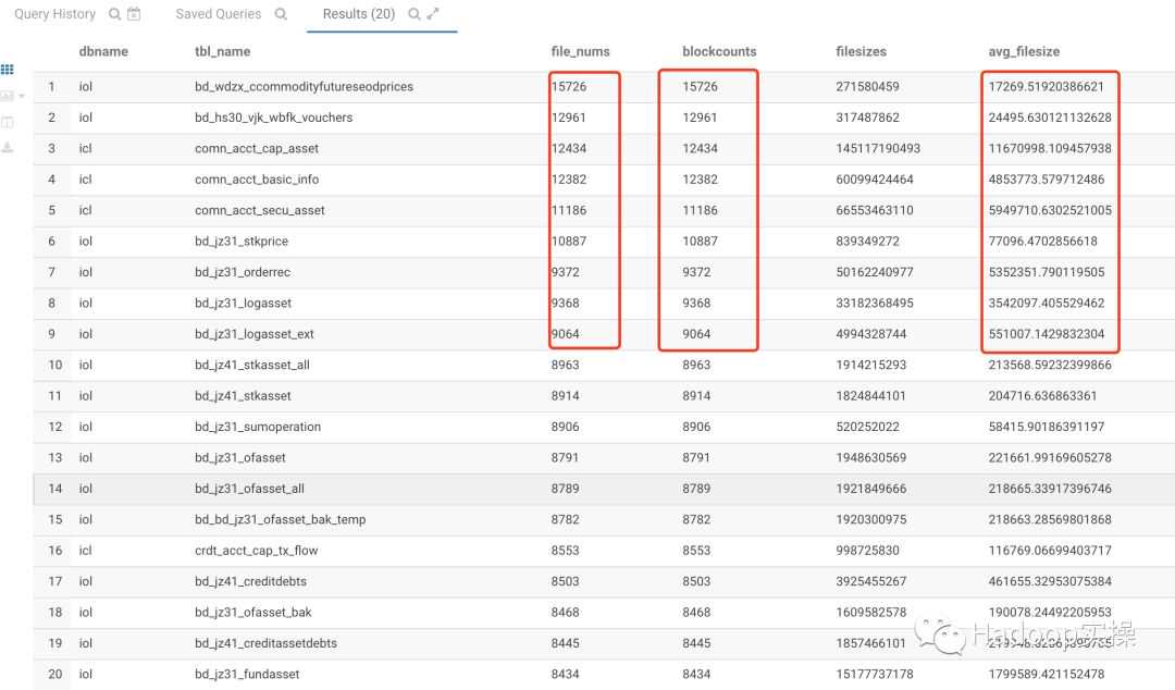 如果file_nums/blockcounts的值越大且avg_filesize越小则说明该HDFS或Hive表的小文件越多。