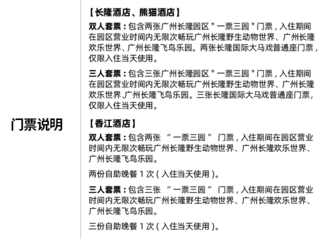这次主要是酒店+门票套餐,超长有效期,不约可退,主题酒店可以选择广州长隆酒店、长隆熊猫酒店、长隆香江酒店。