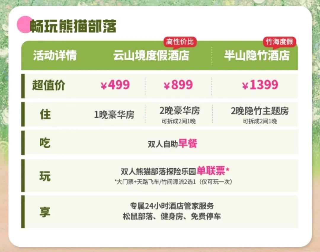 如果想要畅玩熊猫部落,选这几个套餐,性价比很高,两晚也才899,还能拆成两间一晚!