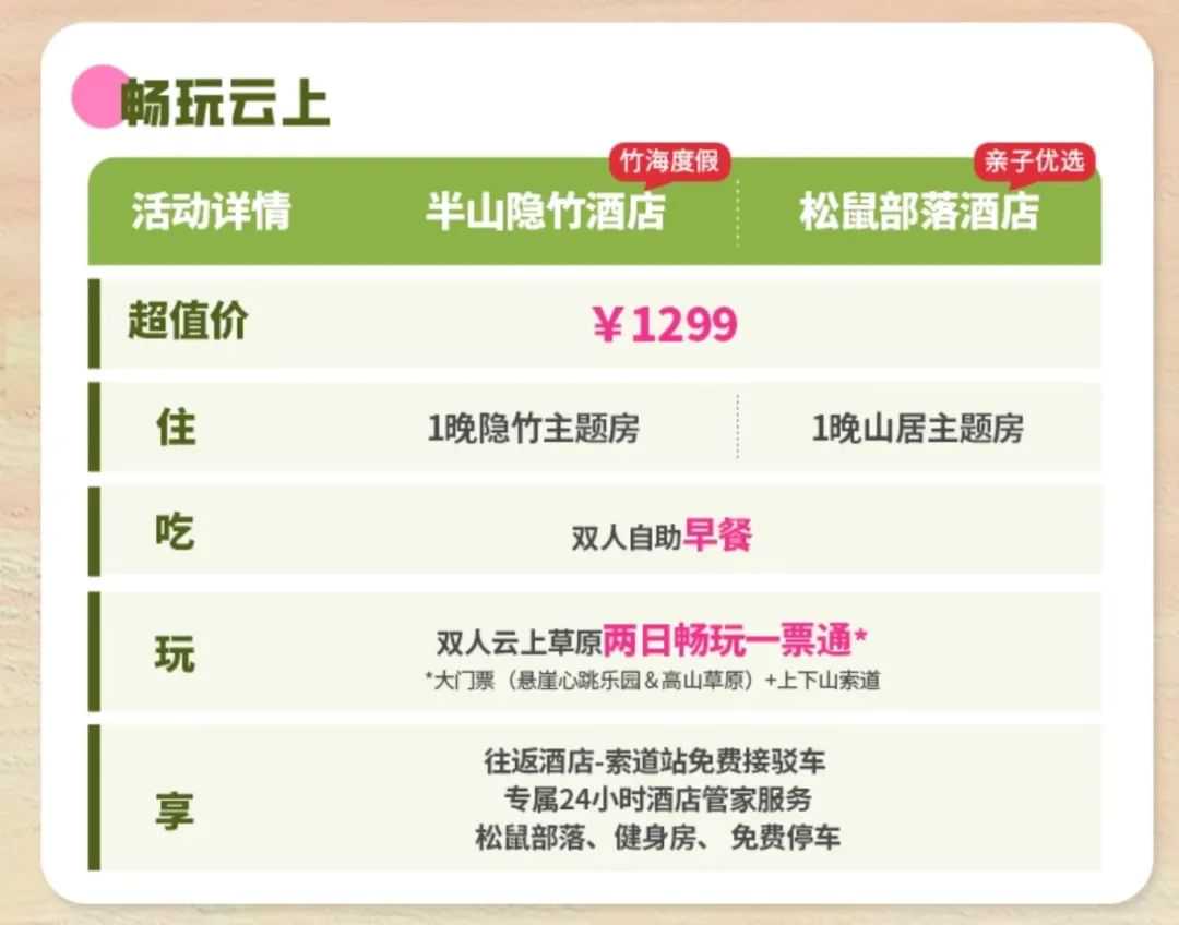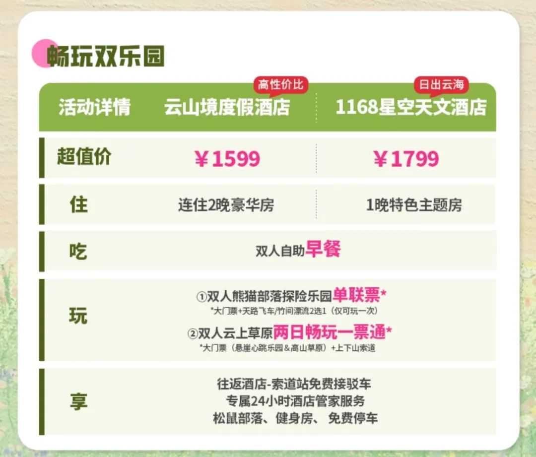 云上草原和熊猫部落都想玩的话,就选畅玩双乐园套餐,一天去一个,安排得明明白白~