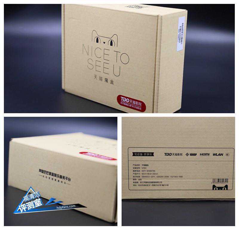 天猫魔盒M16C外包装采用的是黄色硬纸盒包装,包装盒上印有天猫的吉祥物,和中英文标语天猫魔盒+NICETOSEEU,右下角为“TBO天猫影院”标识,前侧为“阿里巴巴家庭娱乐服务平台”,背面为产品信息等标签。