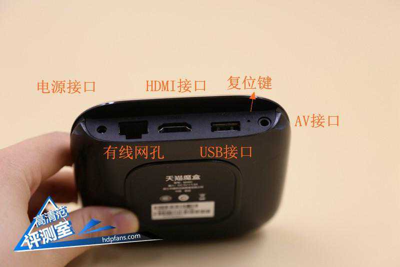 天猫魔盒M16C整体接口设计简单,仅有:电源接口、USB接口、HDMI接口、有线网孔、复位键、3.5mmAV音频接口。底部为天猫魔盒M16C产品信息标签等。