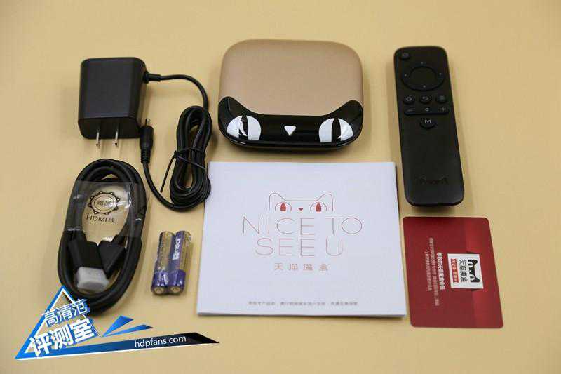 除了主机外,还配置了遥控器、5V/1.5A电源适配器、2节7号电池、HDMI线、使用说明书和天猫魔盒会员卡片。遥控器最底部的“M”键相当于一个快捷键,可以快速打开设定的应用。