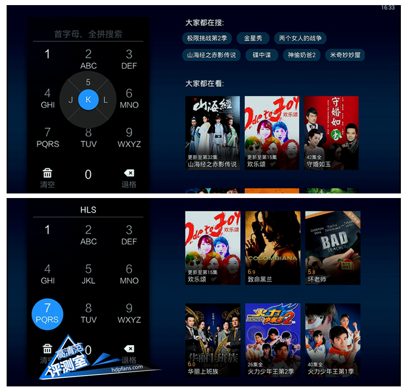 当然,这一款天猫魔盒M16C提供了影视搜索功能,方便用户在内容资源查找时,更快速锁定目标。测评君搜索欢乐颂的首字母,很快就有了结果。