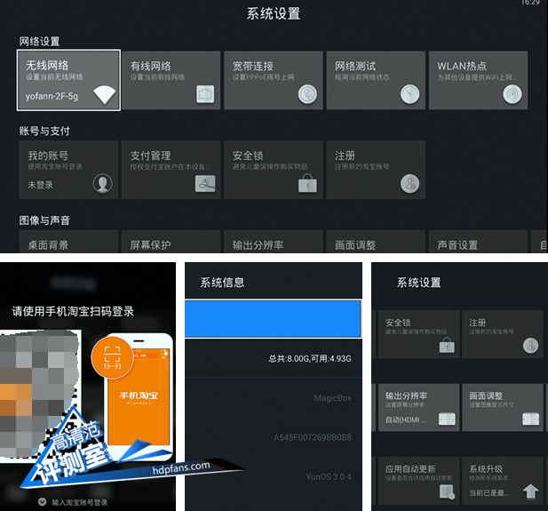 系统设置的界面和其他网络机顶盒有着一点不同,是按分类横排展示,可以设置桌面背景、屏保、分辨率、画面、声音等设置,以及一般功能的设置。