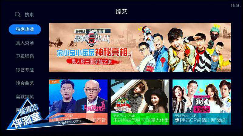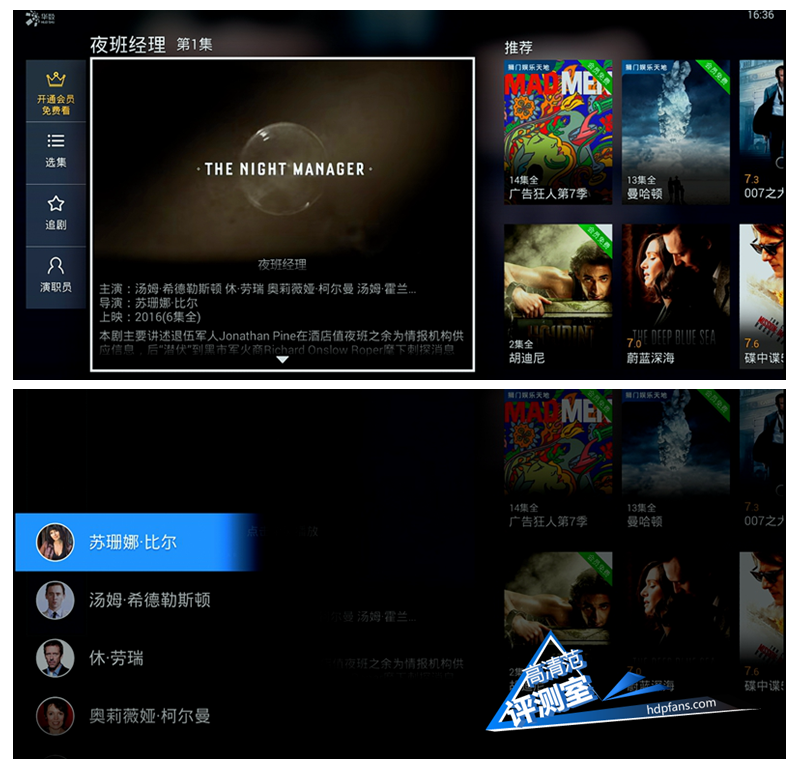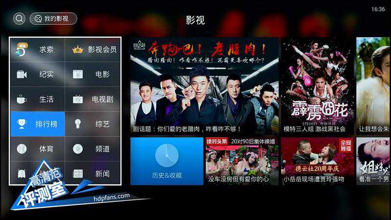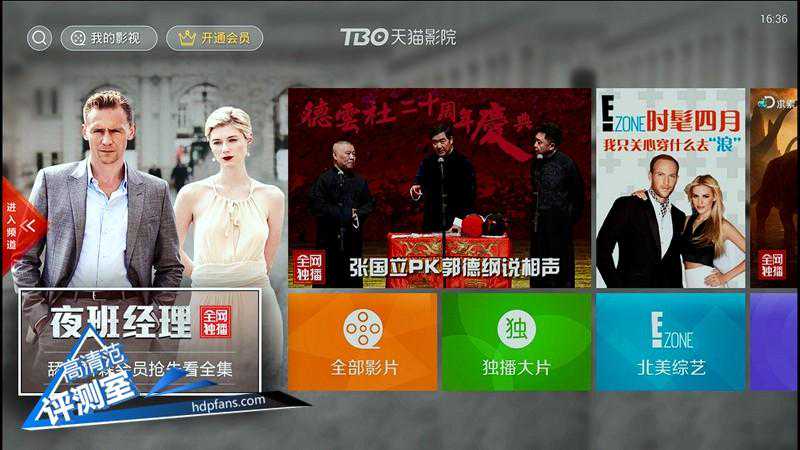 在天猫魔盒M16C中,影视资源中增加了豆瓣评分、演员列表,主要有影视会员、电影、电视剧、综艺、频道、新闻、求索、纪实、生活、排行榜等几大分类。