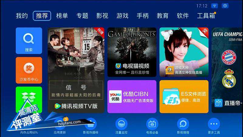 当然还可以安装像沙发管家这样的应用商店进行应用扩展。沙发管家是一款基于安卓系统的智能电视/电视盒应用商店。致力于打造最全面、最简单方便的电视应用商店,为用户提供各类最适合在电视设备上使用的软件和游戏。沙发管家聚合了所有电视设备使用的优质应用和游戏。看电视直播回放、电影大片,用电视玩游戏、看股票、听音乐,管家提供的电视应用中一应俱全。不再为找不到智能电视/电视盒上能用的应用而烦恼。