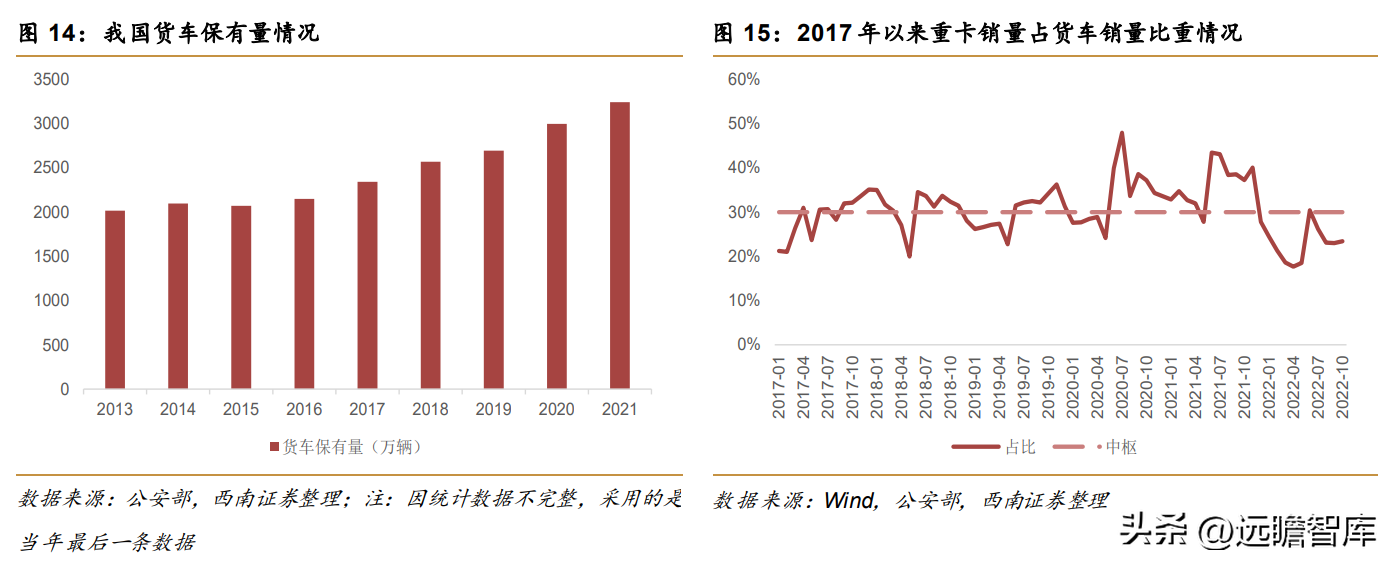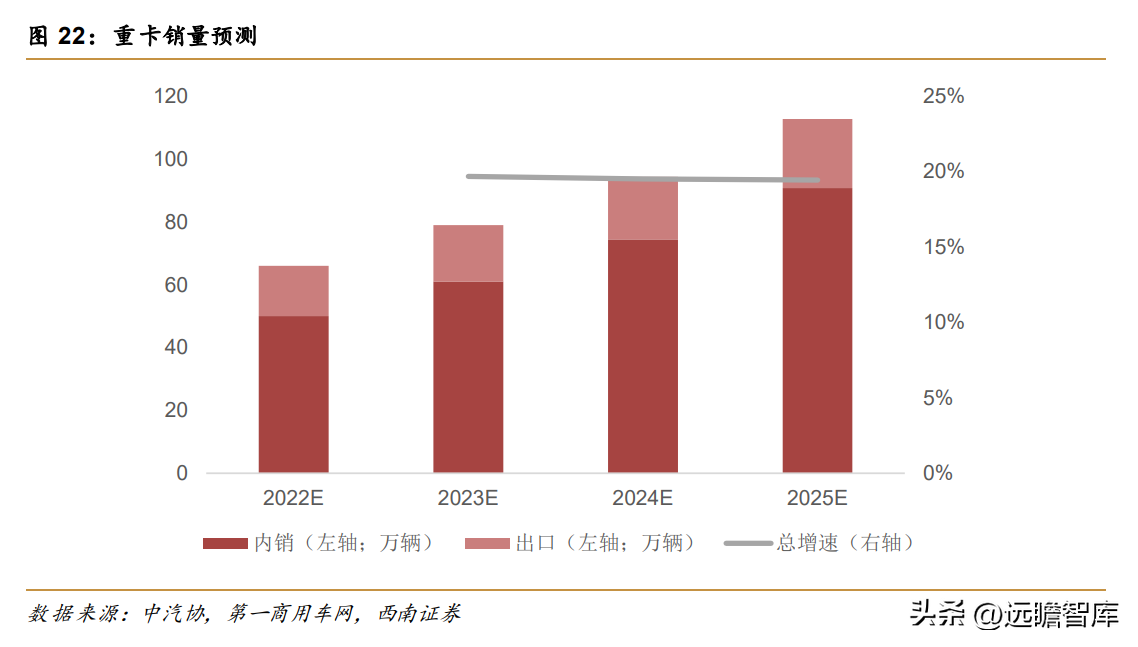 因重卡销量占货车销量中枢为30%,所以假设773万辆中30%是重卡,则重卡内销自22年11月起至2025年结束需完成约232万辆。