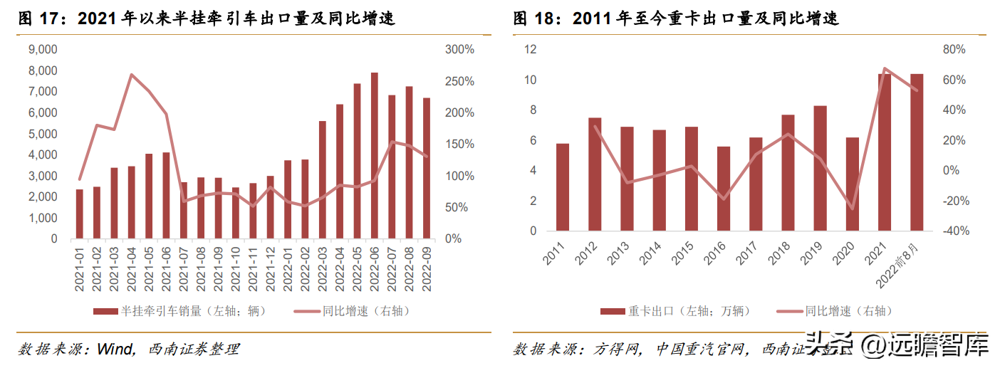 重卡出口持续高增。不同于21年以来整体重卡惨淡的销量,我国重卡出口持续高增,2021年我国重卡出口增速在60%以上,22年前8月,我国重卡出口同比增速也保持在50%以上;其中,根据中汽协披露的半挂月度数据,半挂的出口一直保持50%以上的高同比增长,最新22年9月半挂出口6709辆,同比增长130.8%。