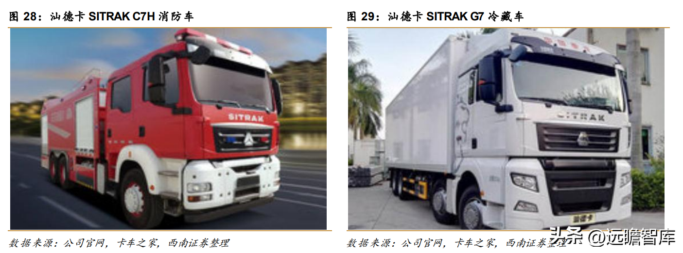 2013年1月17日,中国重汽集团与德国MAN集团强强合作的SITRAK(汕德卡)品牌正式启动,2019年4月1日第3万辆汕德卡重卡下线,汕德卡现已成为中国重汽集团的高端重卡品牌,在业内有着良好的口碑,“进口替代型重卡”成为汕德卡的代名词;而汕德卡旗下不仅有重卡产品,还有消防车、冷藏车、油田作业车等特种车辆,道,汕德卡消防车在国产消防车中占领了高端市场60%以上的份额。